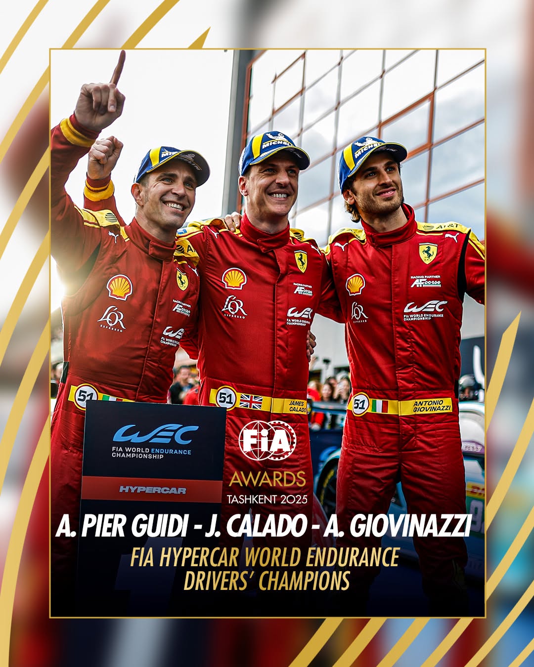 Alessandro Pier Guidi, James Calado & Antonio Giovinazzi - FIA Hypercar World Endurance Drivers' Champion 👏 #FIAAWARDS2...