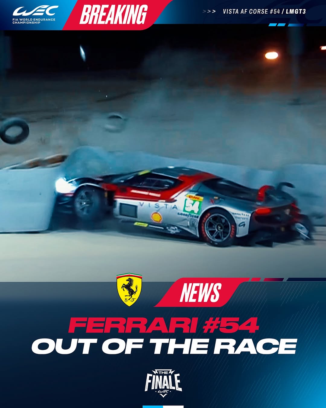 Ferrari OUT of the race ❌ After getting caught up in a Hypercar battle and ploughing into the barrier, #54 Vista AF Cors...