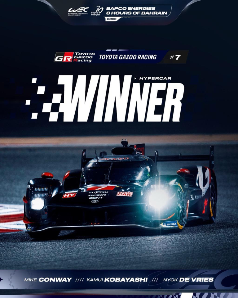 La Toyota n°7 a remporté les Bapco Energies 8 Heures de Bahreïn, 8e et dernière manche de la saison 2025 du FIA WEC, signant du même coup la première victoire du constructeur japonais cette année. Toyota s’offre le doublé avec la deuxième place de la n°8. Avec les 66 points en jeu dans l’escarcelle, Toyota s’adjuge la deuxième place du Championnat du Monde des Constructeurs Hypercars !