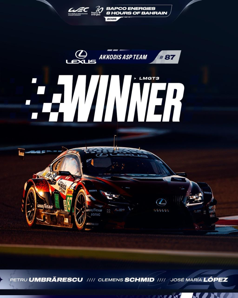 La Lexus RC F n°87 s’est imposée lors des Bapco Energies 8 Heures de Bahreïn, manche finale de la saison 2025 du FIA WEC, dans la catégorie LMGT3. L’équipe française Akkodis ASP signe sa deuxième victoire cette saison, après le succès de la n°87 à Interlagos. Quatrième à Bahreïn, la Porsche Manthey 1st Phorm n°92 décroche le titre LMGT3.